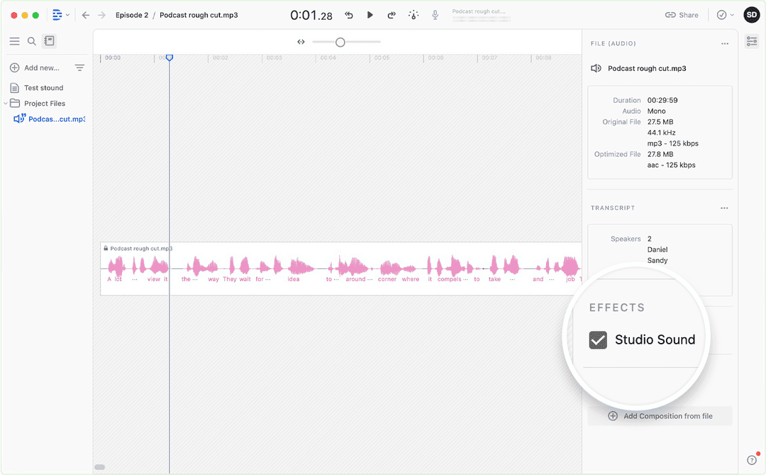 - Upload raw audio into Descript.